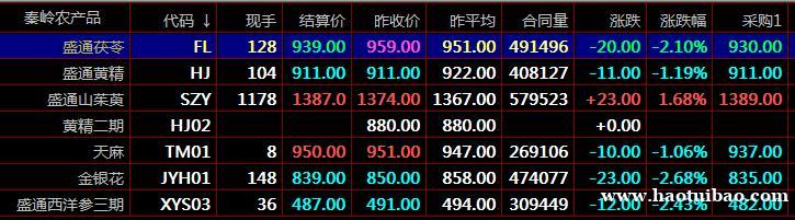 秦岭农产品(白盘: FL盛通茯苓、HJ盛通黄精、;JYH01金银花,XYS盛通西洋参三期, HJ02盛通黄精二期,晚盘: SZY盛通山茱萸,TM01盛通天麻)
